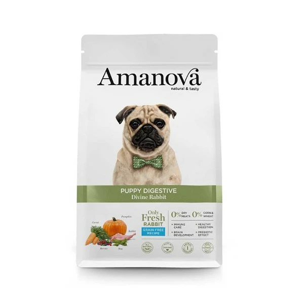 Amanova Puppy Digestive Coniglio Grain Free è un mangime digestivo preparato solo con carne fresca di coniglio come unica fonte animale, povero di grassi, colesterolo e ricco di proteine e minerali essenziali per la sana crescita del tuo cucciolo.