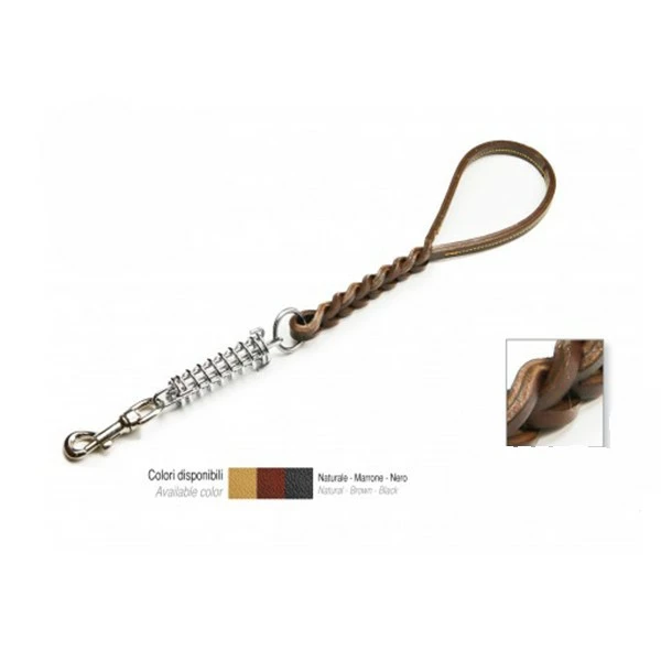 Guinzaglio per cani a doppia treccia con molla, con moschettone e catena; perfetto per qualsiasi condizione meteo, con pratico passante per mano. Questo bellissimo guinzaglio in pelle è realizzato in cuoio intrecciato super resistente. Il passante per la mano garantisce un’ottima aderenza anche in caso di cattivo tempo e la striscia in pelle rimane morbida ed elastica. Potrete così usufruire di un accessorio di ottima qualità per tutte le vostre passeggiate. L’articolo coniuga l’antica manualità artigiana, la tecnologia moderna e materiali di ottima qualità. Realizzato con i migliori pellami toscani. E’ un prodotto della linea Eurocuoio by Nuova Cuoio. E’ un prodotto Made in Italy.