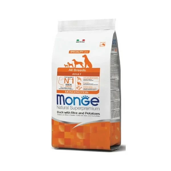 Le crocchette Monge Natural Superpremium Speciality Line Adult con Anatra, Riso e Patate sono un alimento completo e bilanciato per cani adulti di tutte le razze che necessitano di alimenti ad alta digeribilità.