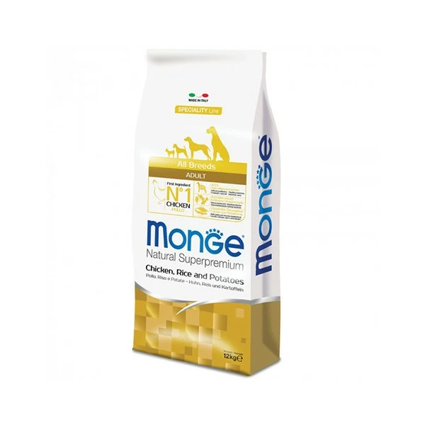 Monge Natural Adult Pollo, Riso e Patate è un alimento secco completo per cani di tutte le taglie oltre i 12 mesi di età. La sua formula esclusiva è sviluppata per aiutare gli animali che hanno l’esigenza di controllare il peso e necessitano di un alimentazione povera di colesterolo. Grazie alle proteine ad alto valore biologico, come quelle di patata, alle vitamine e antiossidanti, queste crocchette prevengono l’invecchiamento cutaneo e apportano carboidrati altamente digeribili come quelli del riso. Inoltre, il complesso di acidi grassi e minerali contenuto in questo cibo, permette di mantenere la cute sana ed il pelo lucido e brillante, mentre Glucosamina e Condroitina favoriscono la salute delle articolazioni e un mantenimento ottimale dell’apparato scheletrico.