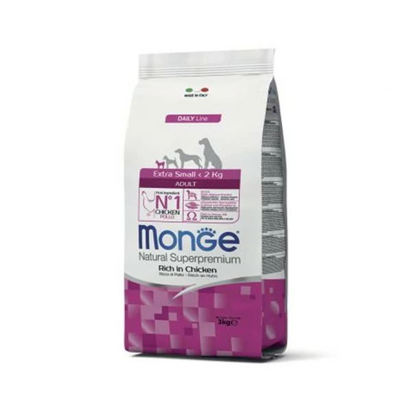 Monge Natural Extra Small Adult Ricco di Pollo è un alimento secco completo per cani adulti di taglia molto piccola. Il suo complesso nutrizionale è sviluppato per garantire il benessere del cane grazie alla presenza di elementi nutritivi di altissima qualità, frutto della ricerca Made in Italy.