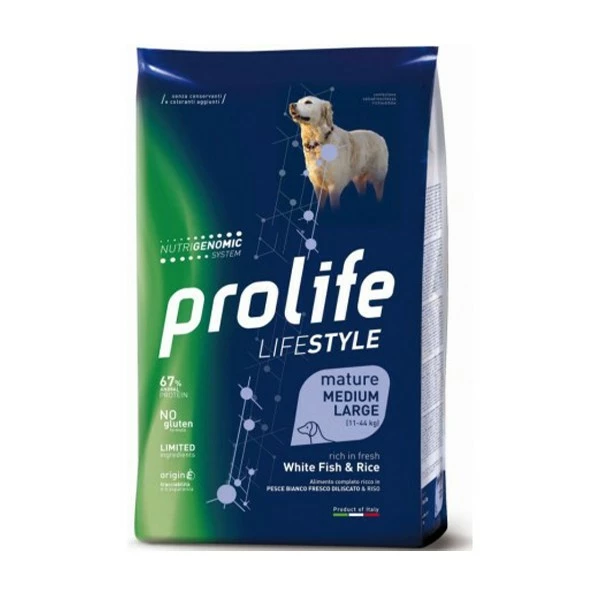 Prolife Mature Medium Large Pesce Bianco e Risoè un alimento completo ricco di carne fresca di pollo e riso per il cane anziano (oltre 7 anni) studiato in base al fabbisogno nutrizionale del cane anziano che necessita di un apporto calorico controllato. Il pesce bianco è una fonte proteica appetibile ma leggera e digeribile, adatta al fabbisogno del cane anziano che spesso presenta difficoltà digestiva. La particolare composizione delle crocchette ben si adatta alle gengive e ai denti, resi più delicati e sensibili dall’età, favorendo la masticazione e la digestione dell’alimento.
