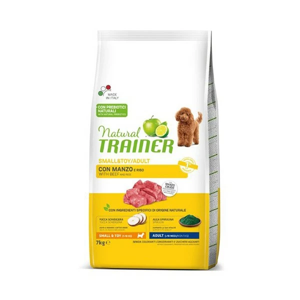 Natural Trainer Small&Toy Manzo e riso è un alimento completo per cani adulti di taglia piccola/toy. Alimento secco a supporto della vitalità del cane adulto, formulato e prodotto in Italia.