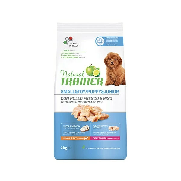 Natural Trainer Small&Toy Puppy&Junior Pollo e riso è un alimento completo per cuccioli (fino a 12 mesi) di taglia piccola/toy. Prodotto in Italia, nel pieno rispetto del Baby Care Program, programma nutrizionale per accompagnare il tuo cucciolo durante il primo periodo di vita.
