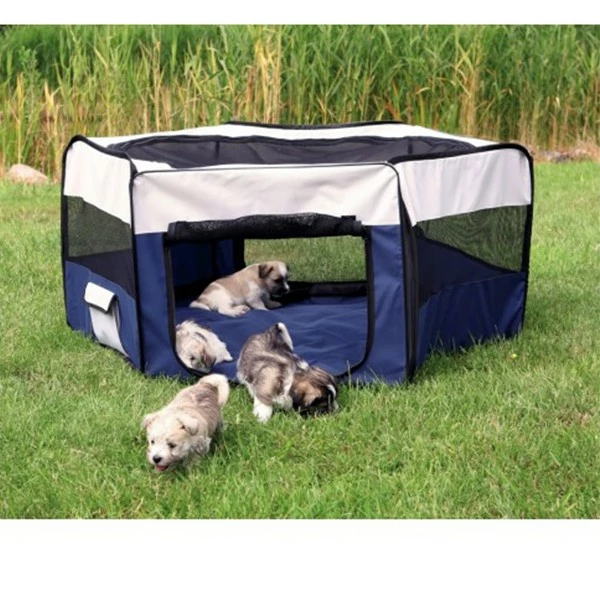 Recinto in poliestere resistente. Per uso interno ed esterno. Il fondo può essere rimosso per permettere il contatto diretto con il tappeto erboso. Il rivestimento in gomma ed il bordo rinforzato del fondo impediscono che il pavimento si sporchi e proteggono dall’umidità del suolo del giardino. Con 2 pratiche tasche esterne. Si fissa al suolo con gli occhielli. La rete staccabile impedisce che l’animale salti fuori. Pieghevole e salva-spazio. Con pratica borsa per il trasporto. Facile da pulire con un panno (la rete staccabile ed il fondo si possono lavare a mano). Colore: blu/grigio. Adatto per Cani, cuccioli, porcellini d’ india e conigli.